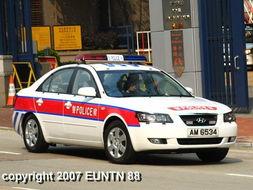 图片展示:一张90年代国产警车(轿车)的照片,车身涂有警徽、警灯,车顶装有警笛。